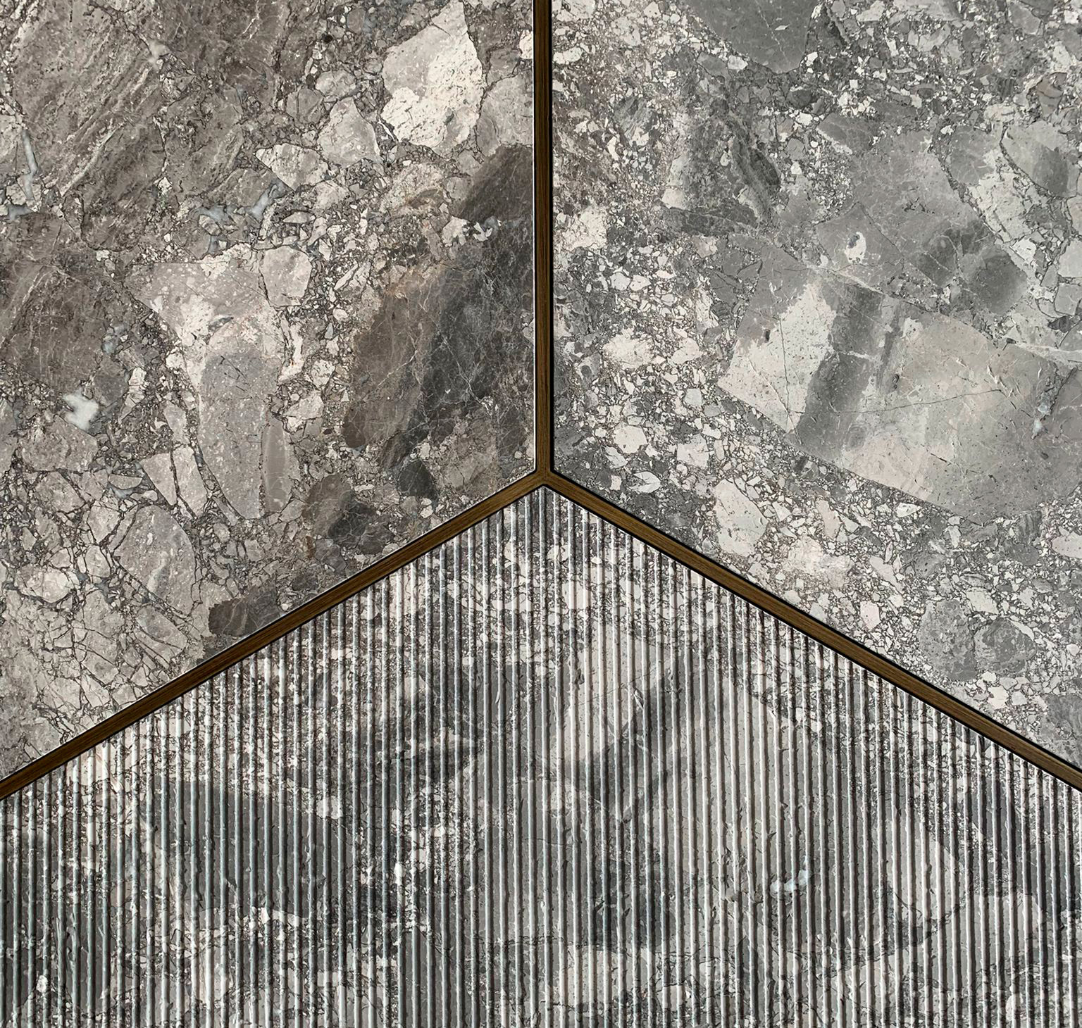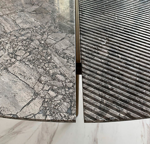 The stone surface combines three finishes: polished, matte leather texture and bamboo ribbed marble texture.